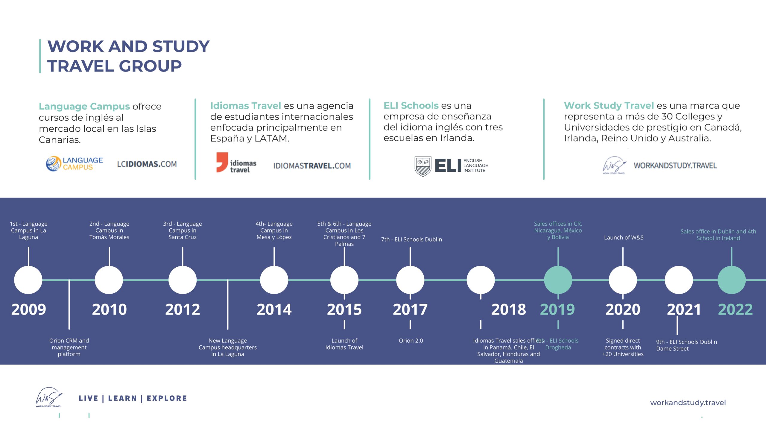 La primera marca del Grupo Work and Study Travel Group, nace en Tenerife, España. Language Campus es el conjunto de academias de idiomas líder en el archipiélago. En ellas se imparten clases de idiomas y se empezaron a ofrecer viajes de idiomas al extranjero.